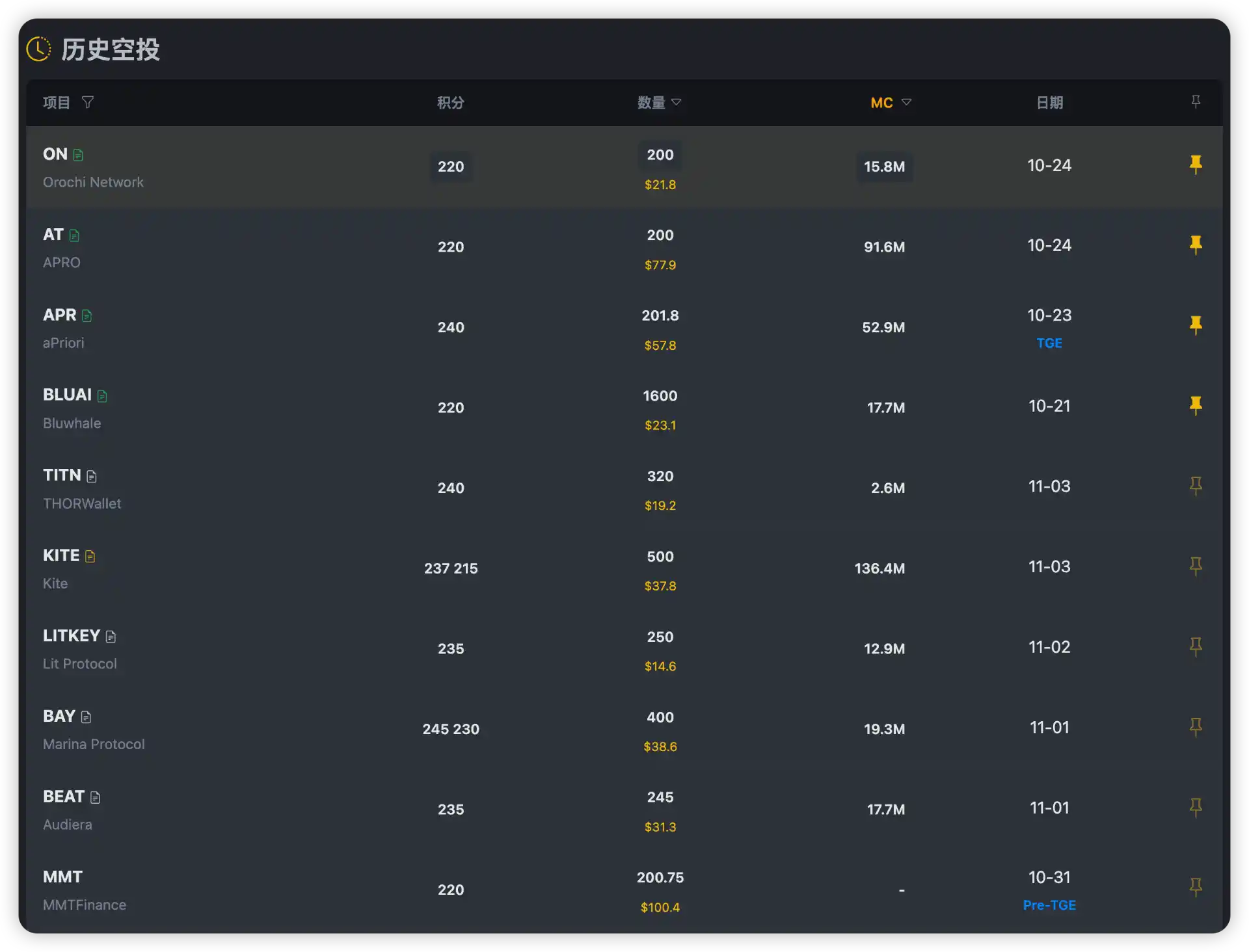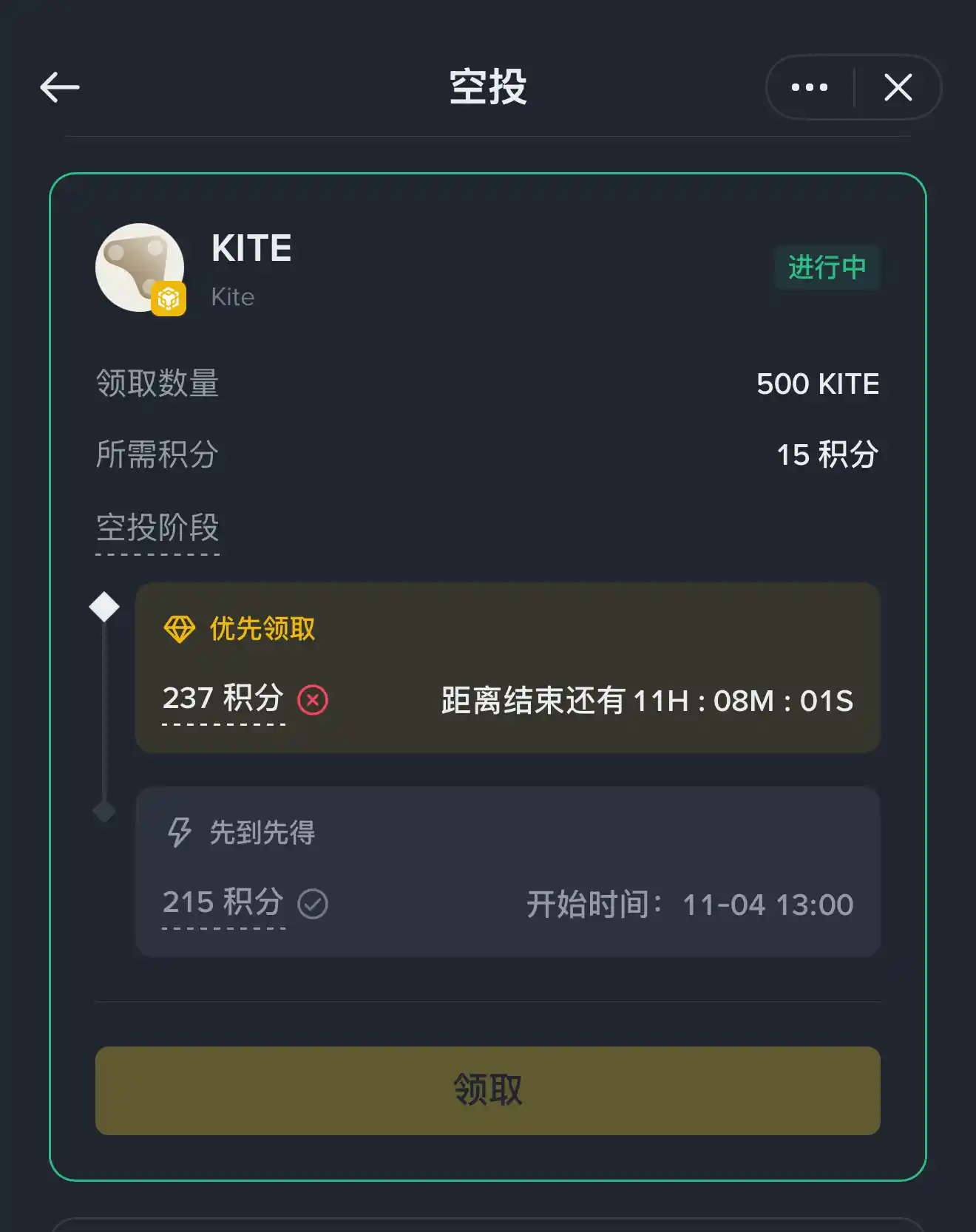 抢空投的资格分一般是210分,每抢一次空投消耗15分,那么一个周期内大概最多可以抢3次。