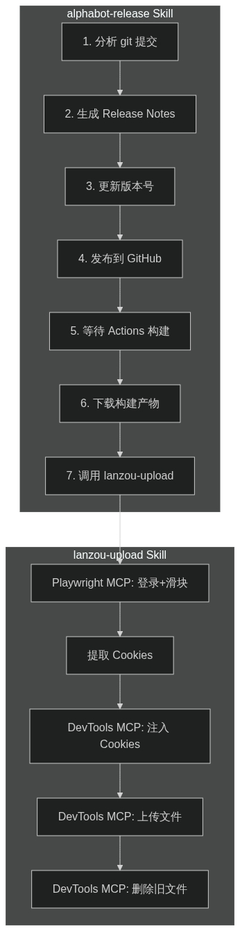 alphabot-release 在最后一步会调用另一个 Skill lanzou-upload,专门处理蓝奏云上传。而 lanzou-upload 内部又会调用两个 MCP(Playwright 和 DevTools)来完成浏览器操作。